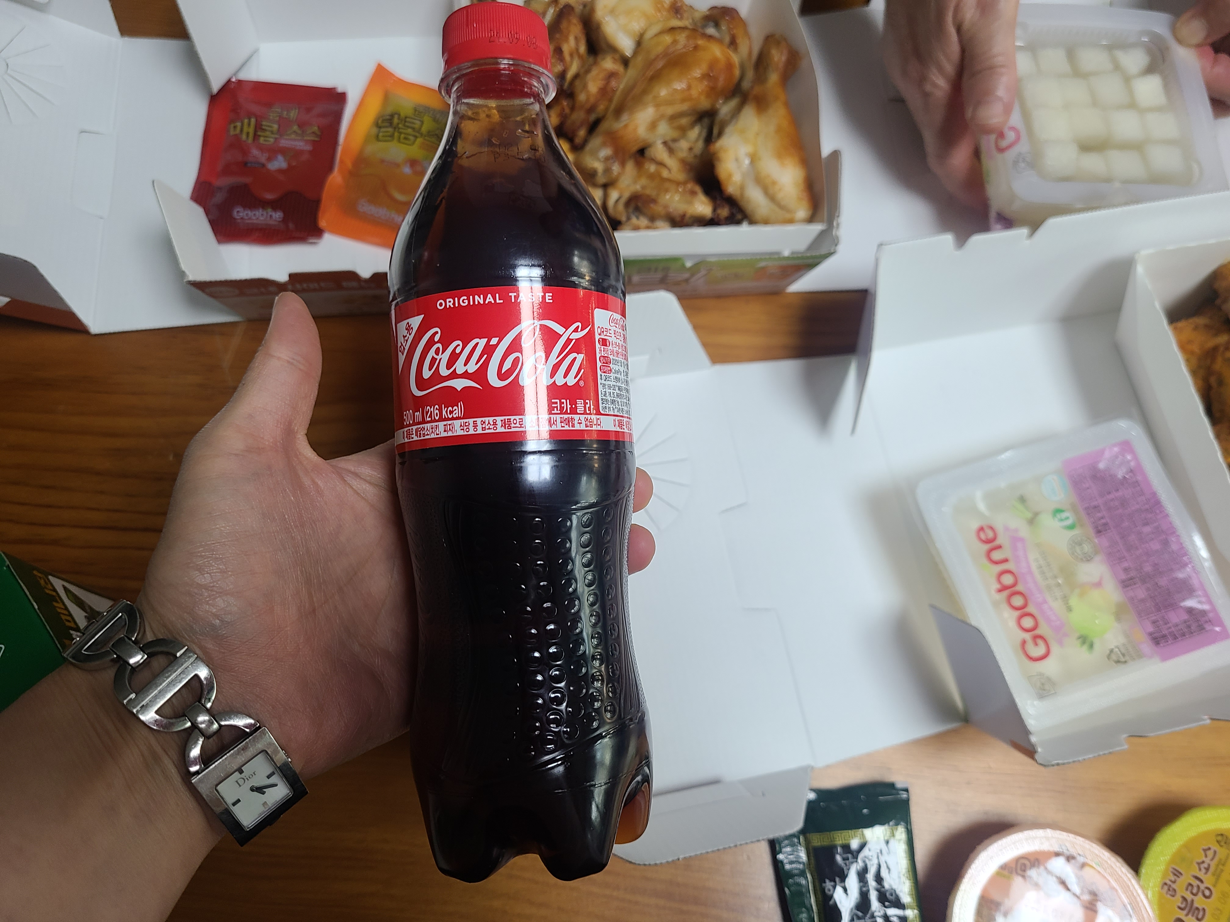 2마리나 시켰으니 콜라하나는 서비스, 더불어 쏘맥미니잔까지 준다. 주류사 컵 같은 건, 귀찮은 쓰레기... 이지만 귀여운 하트라서 지금은 귀여운 수중식물의 화분이 되었다~