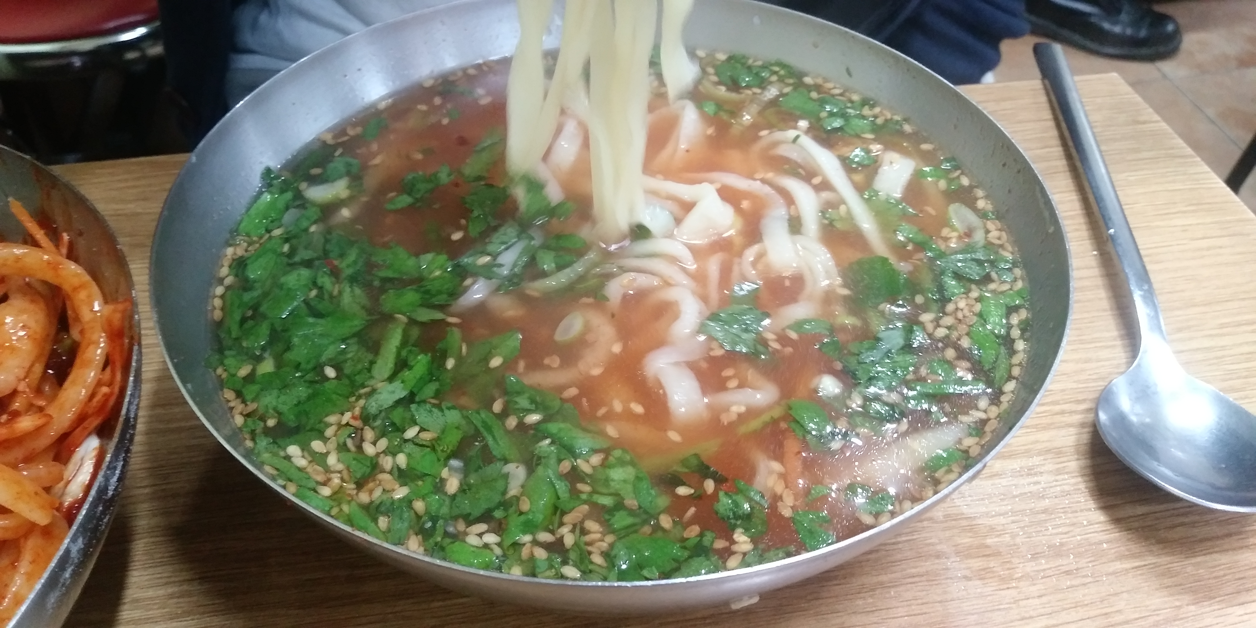 매콤하고 뜨끈한 칼국수 국물에 쑥갓 잎파리 같은 게 들어가서 향긋하고 맛있다.
