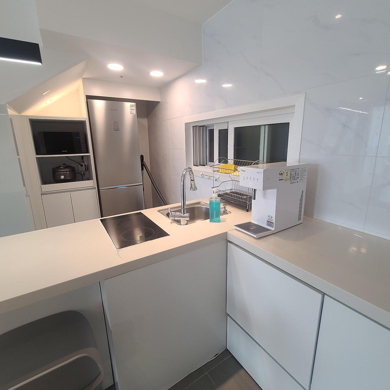 냉장고도 크고, 밥솥, 전자레인지 다 있고, 넓은 소파와 거실이 있다.