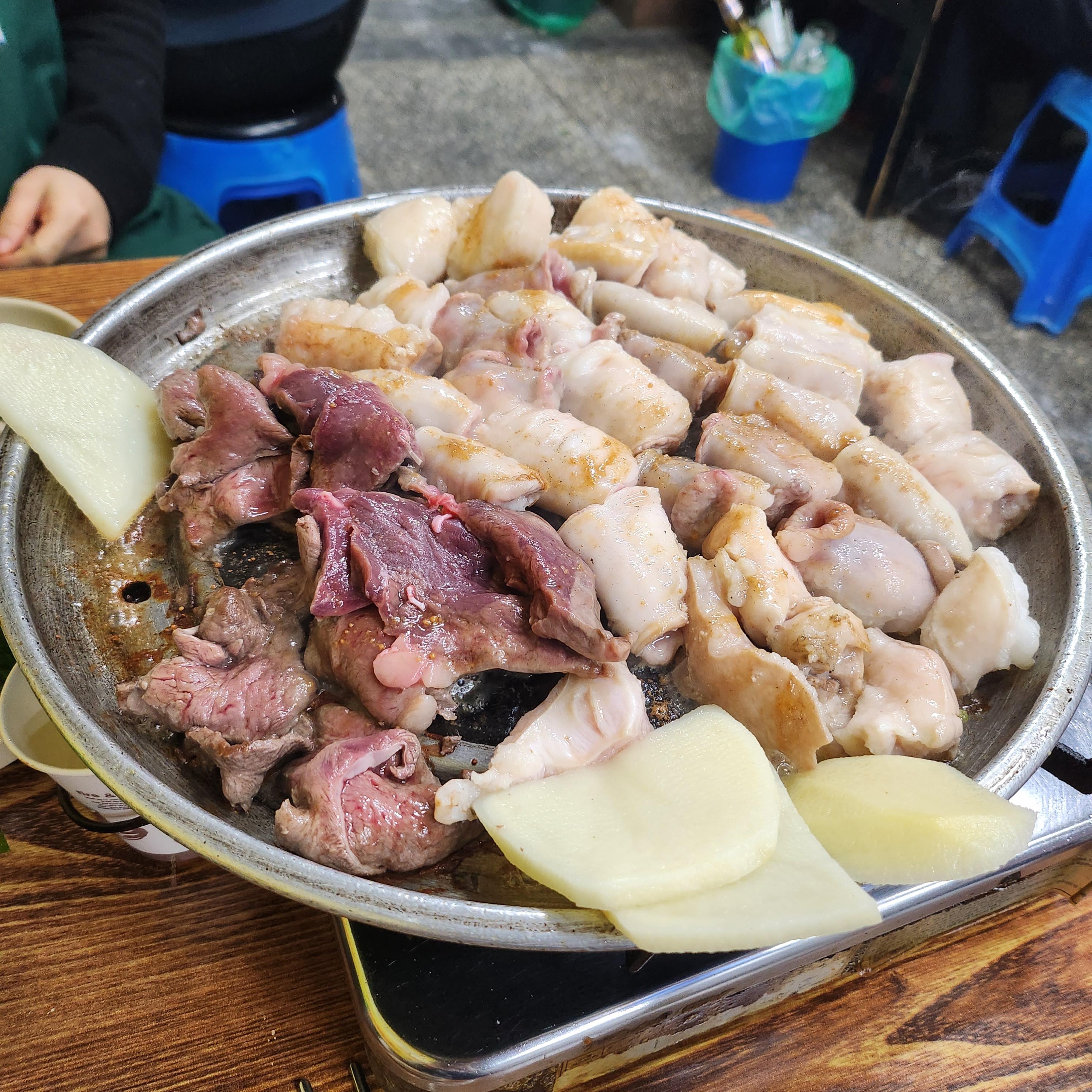 염통하고 대창, 곱창 다 섞여있는 것 같은데 뭐가 뭔진 모르고 먹었다.