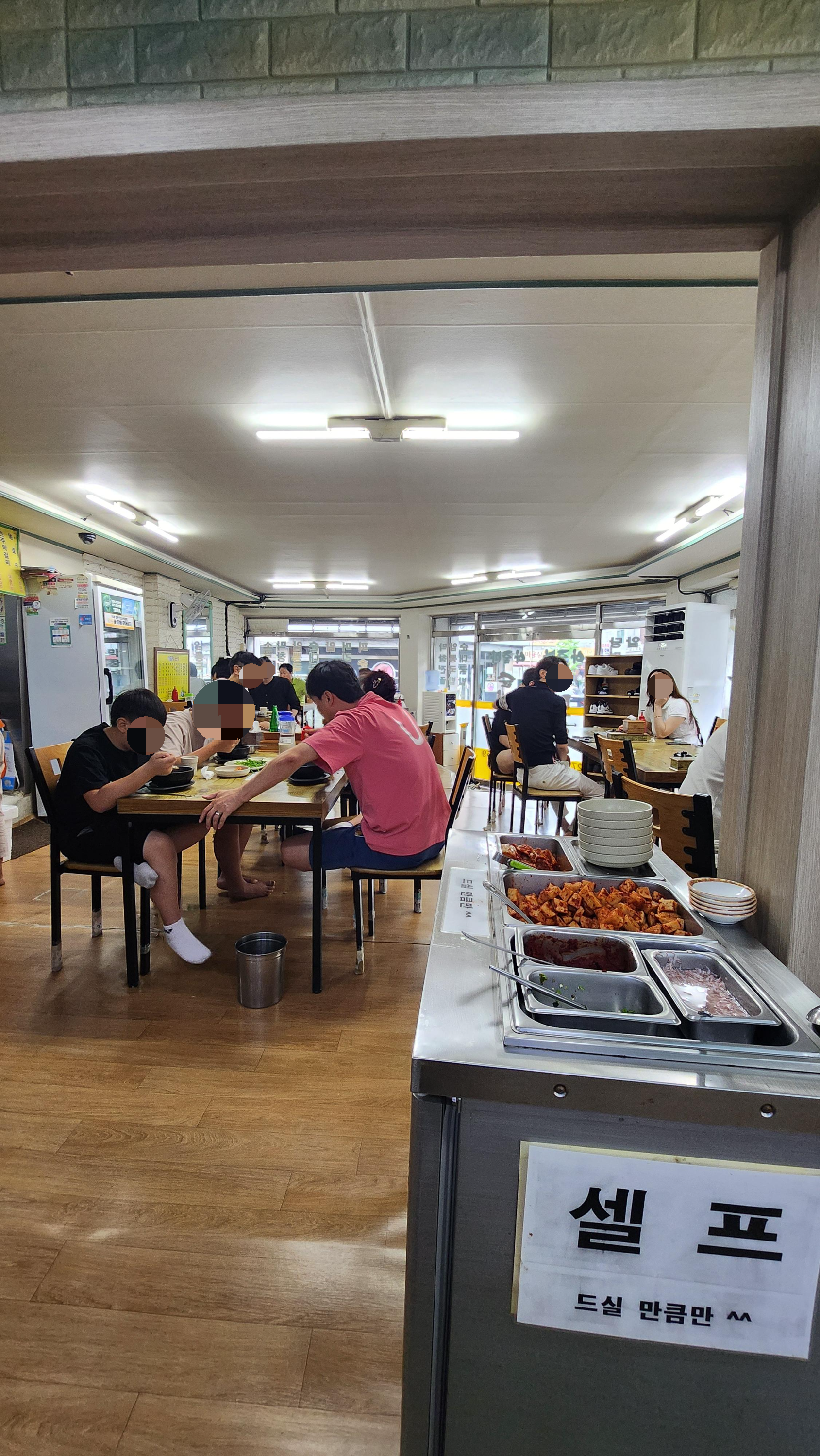 부추가 수북한 기본찬은 옆 셀프바에서 자유롭게 리필해 먹을 수 있게 되어 있다.