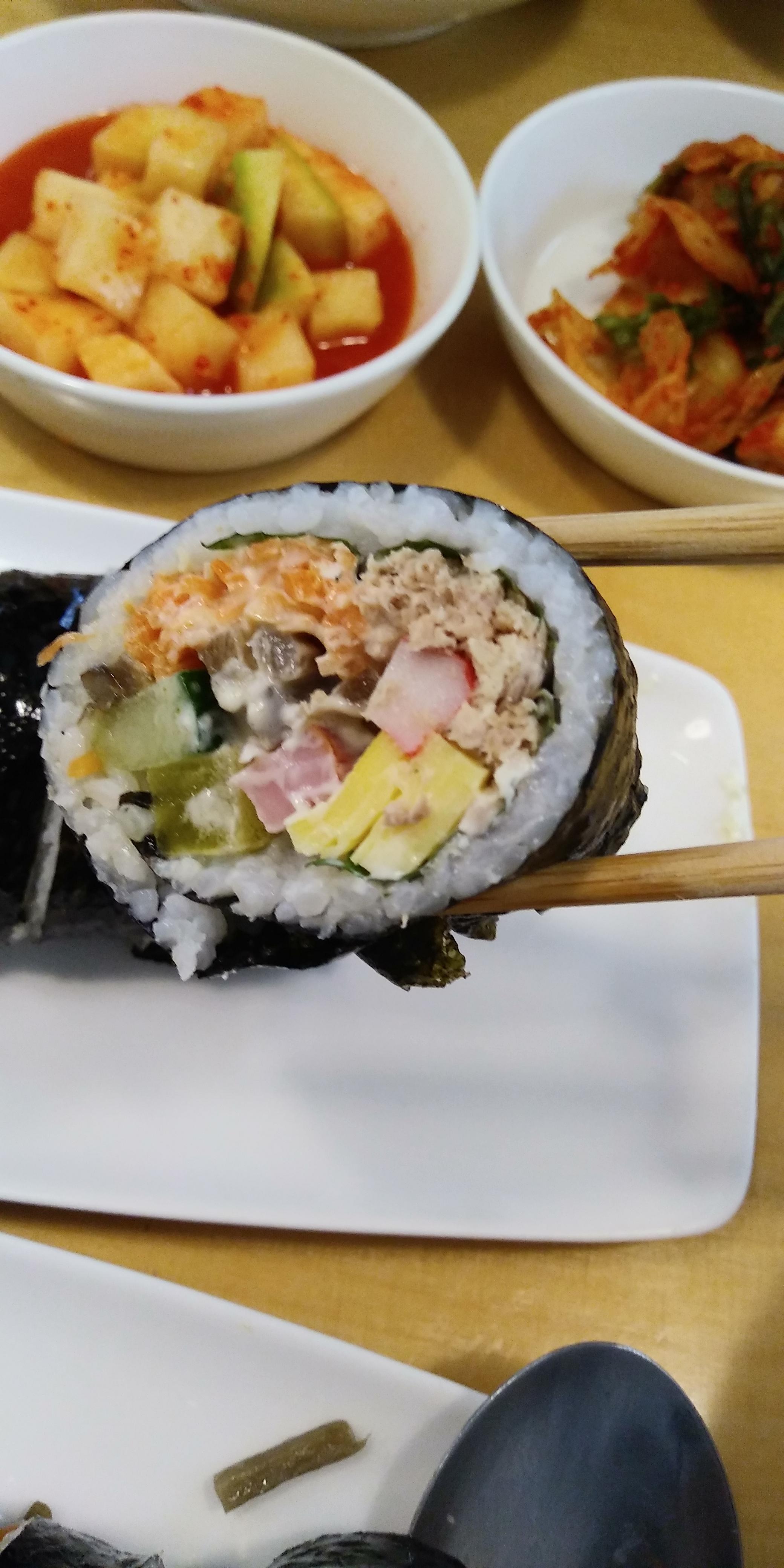 근데 양념 안 된 싱거운 유부(마르고 퍽퍽)로 하는 김밥은 처음이라 이상했다.